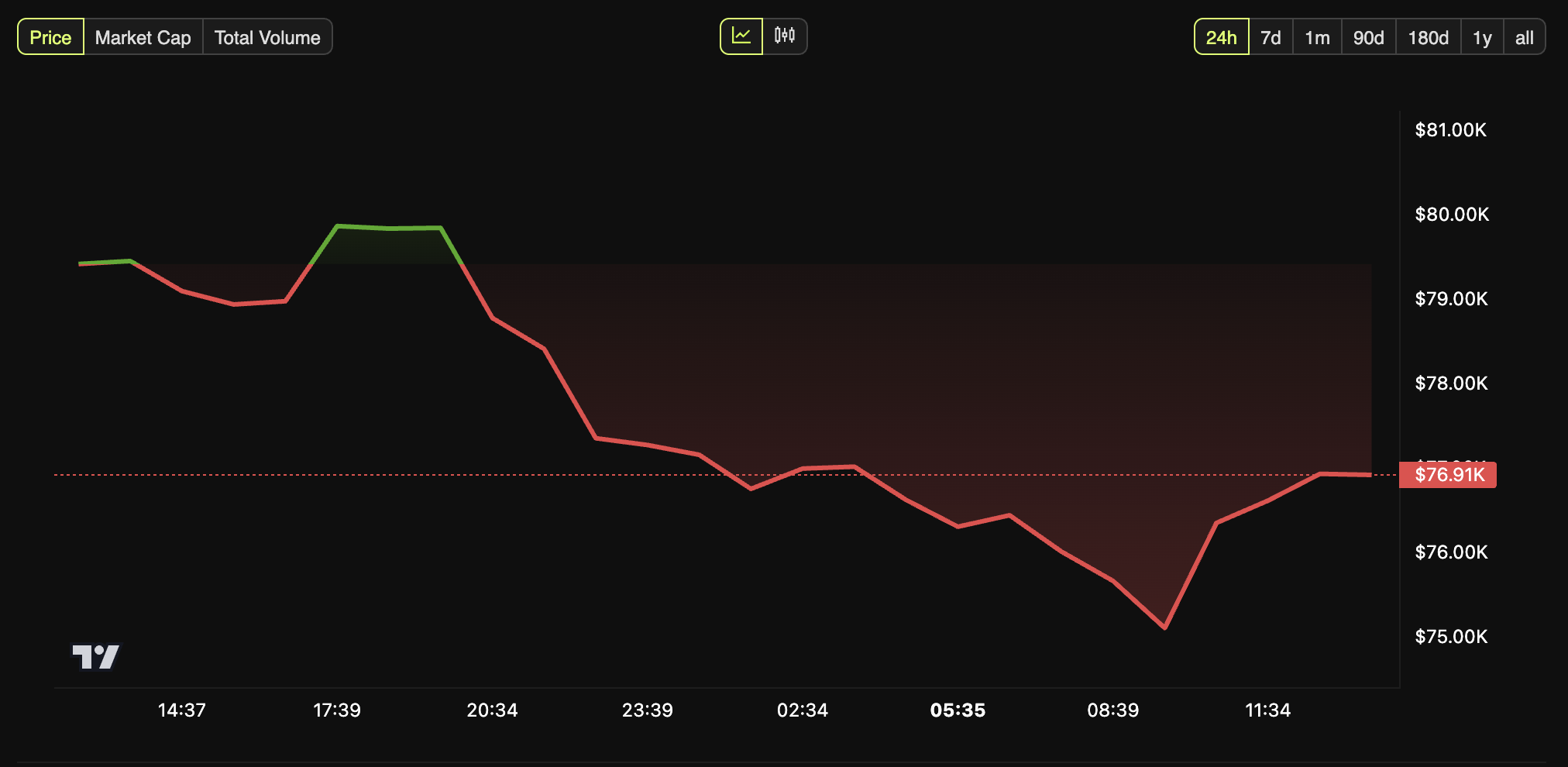 Na razie rynek wydaje się mocno niedźwiedzi. Dane od BeInCrypto pokazują, że w ciągu ostatniego dnia BTC spadł o 3,1%. W momencie pisania tego tekstu, handlował na poziomie 76 914 USD.
