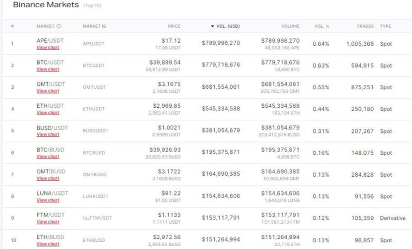 Należą do nich ApeCoin (APE) (uruchomiony w marcu 2022 r.), a także inne, takie jak Bitcoin (BTC), Ethereum (ETH), Terra (LUNA), Fantom (FTM) i GMT Token (GMT) sparowane z USDT i BUSD.