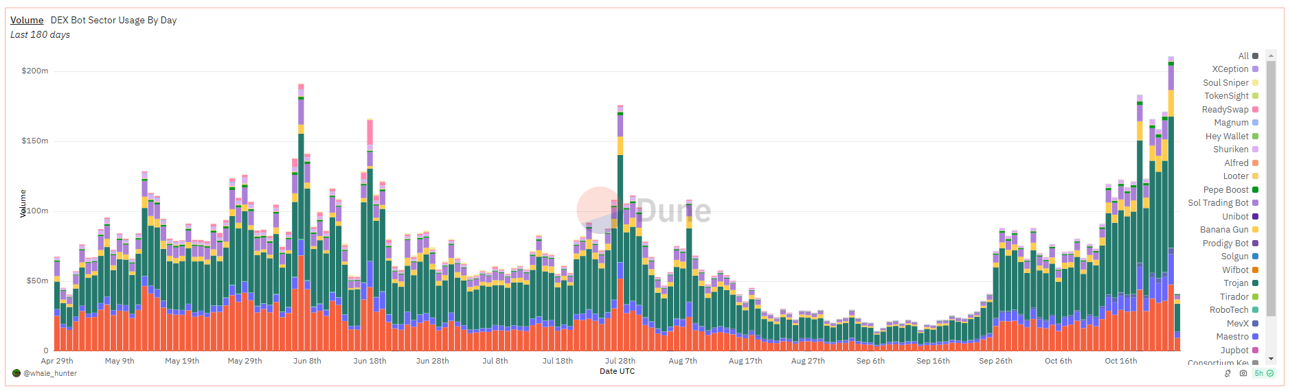 Natomiast, od 19 października aktywność gospodarcza Solany stale przewyższa aktywność Ethereum. Oznacza to wyraźną zmianę na rynku. Ponadto zaangażowanie botów DEX na platformie Solana gwałtownie wzrosła. W związku z tym, że dzienny wolumen handlu botami wzrósł prawie 70-krotnie w ciągu dwóch miesięcy, z około 30 mln USD we wrześniu.