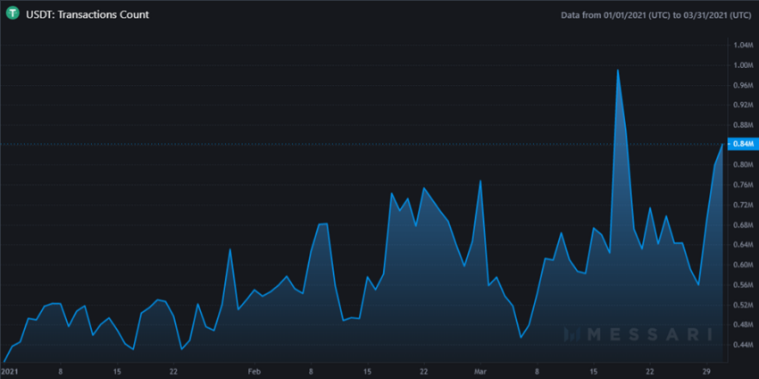 Był to 99% spadek ogólnej liczby transakcji USDT w pierwszym kwartale 2021 r. do 52 459 262.