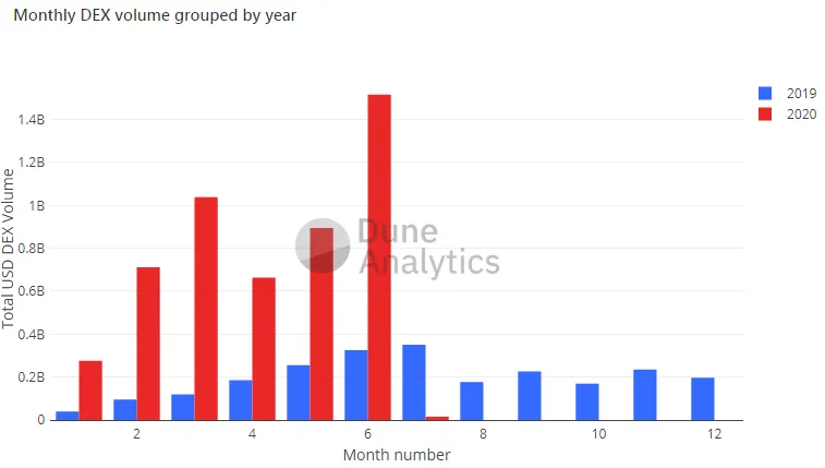Giełdy zdecentralizowane wykazują ogromny wzrost – dane z Dune Analytics pokazują, że wolumen DEX w pierwszym półroczu 2020 r. był pięciokrotnie większy niż w tym samym okresie roku 2019. W roku 2020 wolumen DEX-u wyniósł 5,1 mld dolarów, a w samym czerwcu – 1,5 mld dolarów.