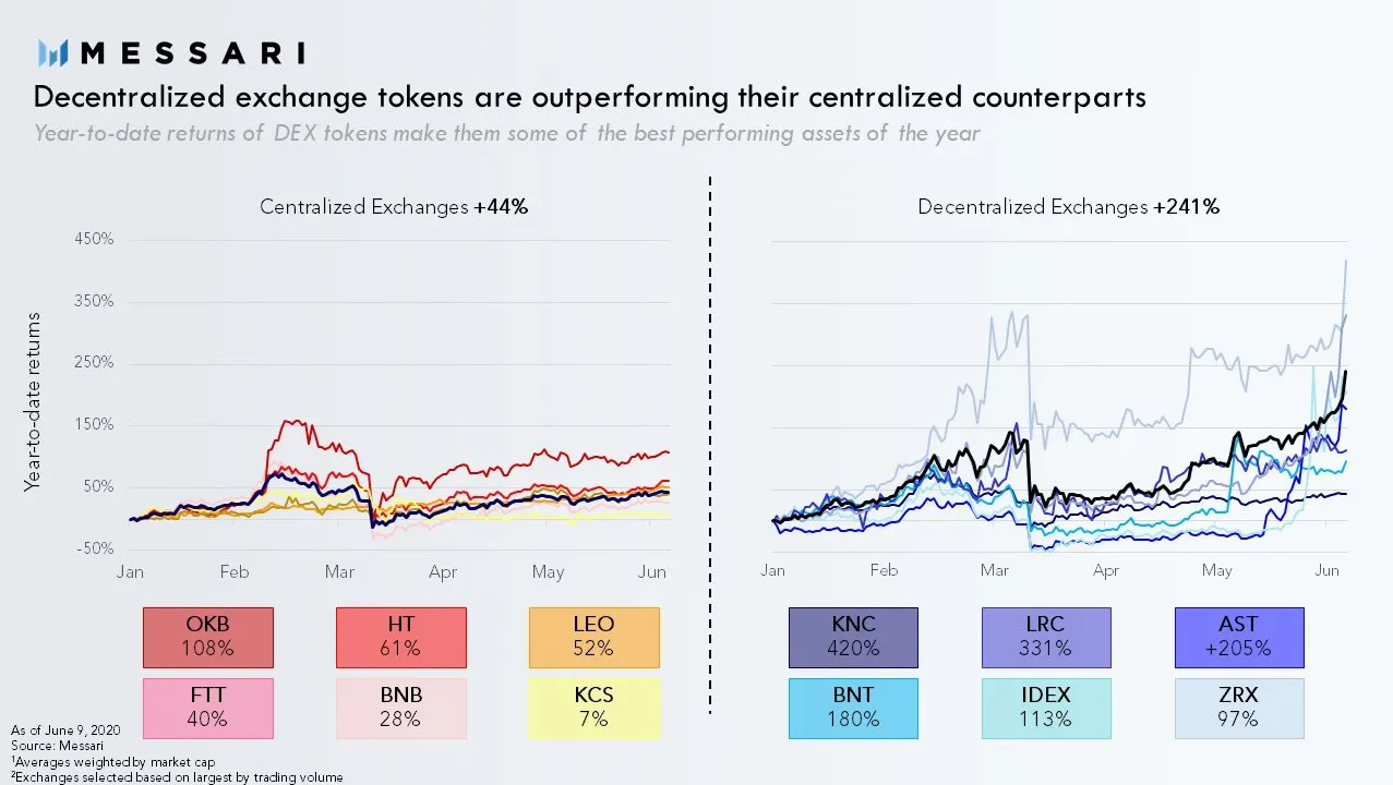 Według raportu opublikowanego przez Messari tokeny DEX pięciokrotnie przewyższyły również coiny scentralizowane na giełdzie w kontekście ceny. W porównaniu do średniego wzrostu coinów giełdowych o 44%, tokeny DEX wzrosły o 241%, przy czym Kyber Network wykazuje najwyższy wzrost na poziomie ponad 400%.