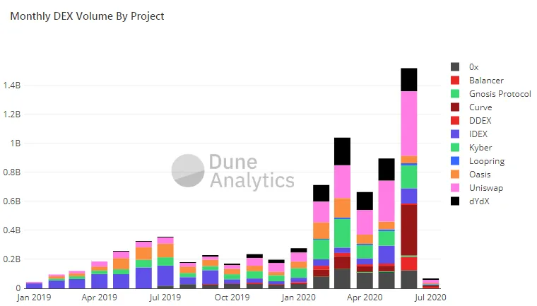 SponsoredWzrost ten jest zauważalny nawet, biorąc pod uwagę standardy na rynku DeFi, który gwałtownie wzrósł od czasu wprowadzenia tokena COMP (Compound Finance). W maju obroty DEX-ów wyniosły ok. 894 mln dolarów i wzrosły c o 70% na koniec czerwca, gdzie zanotowano 1,5 mld dolarów. W czerwcu 2019 r. wartość ta wyniosła zaledwie 325 mln dolarów.