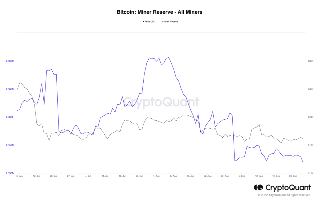 Podobny trend rozgrywa się w przypadku górników. Według danych CryptoQuant, rezerwy górników Bitcoina zatrzymały się na poziomie 1,86 miliona tokenów. Utrzymywały się wokół tego poziomu przez prawie miesiąc. Brak aktywności wśród górników następuje po znacznej wyprzedaży w sierpniu.