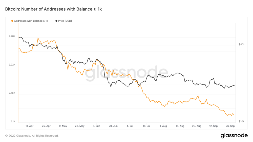 Spadek zainteresowania Bitcoinem można również zauważyć z perspektywy on-chain. Według danych Glassnode, liczba adresów posiadających co najmniej 1000 BTC utrzymywała się na stałym poziomie około 2117 adresów w ciągu ostatnich trzech dni. Wcześniej jednak gwałtownie spadła o 26,75%. Takie zachowanie rynku sugeruje, że duzi inwestorzy stracili zainteresowanie gromadzeniem większej ilości monet.