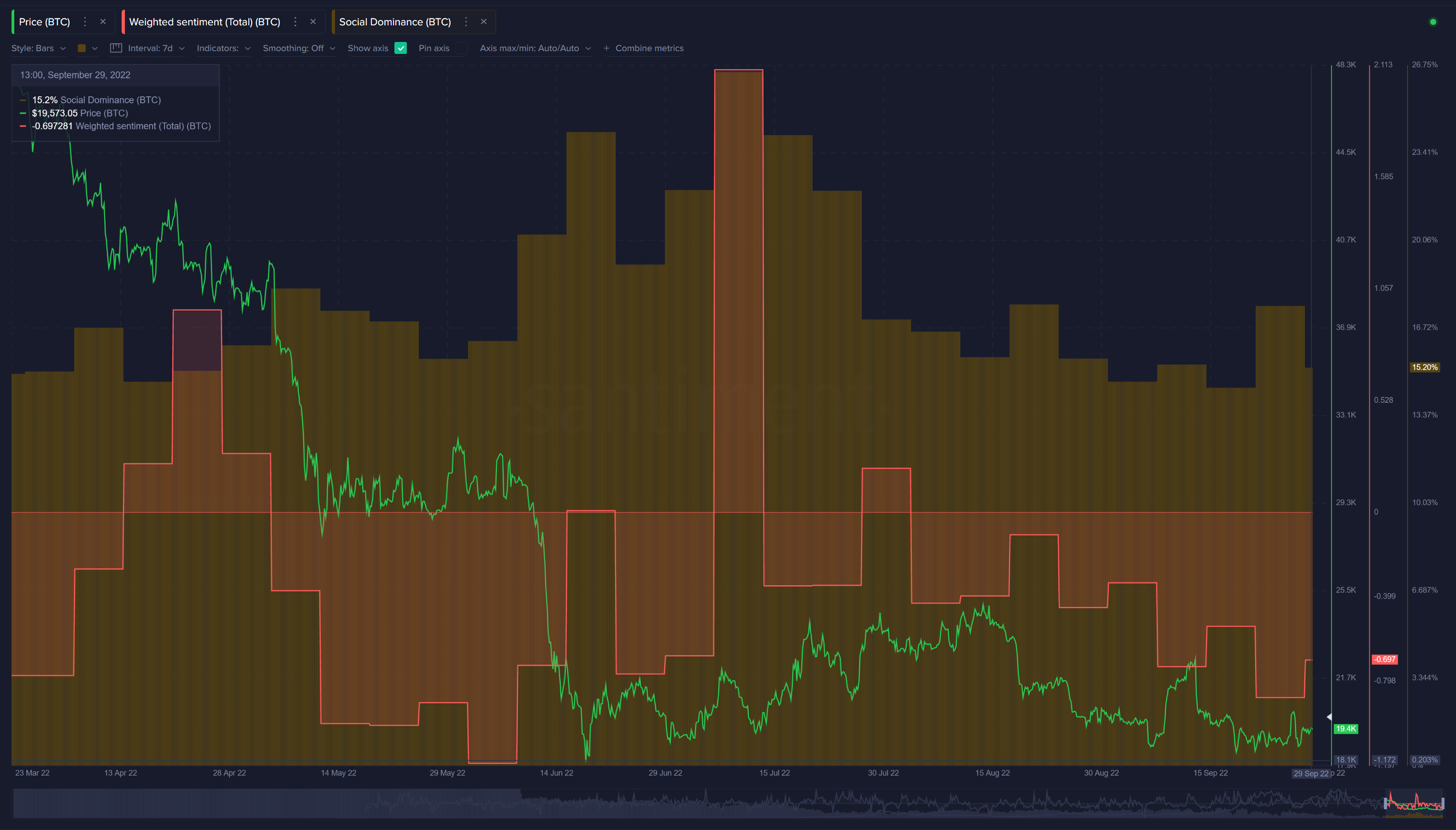 Bitcoin konsoliduje się wokół poziomu wsparcia 19 000 USD. Sentyment rynkowy wciąż pozostaje negatywny. Dane od Santiment pokazują ważony wynik sentymentu na poziomie -0,69. Z kolei rozmowy o Bitcoinie w mediach społecznościowych kształtują się poniżej 20%, co wskazuje na spadek zainteresowania.