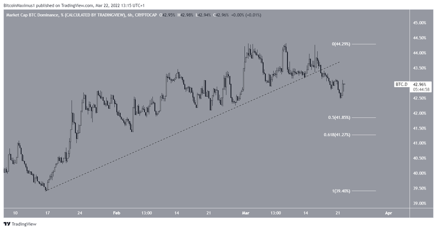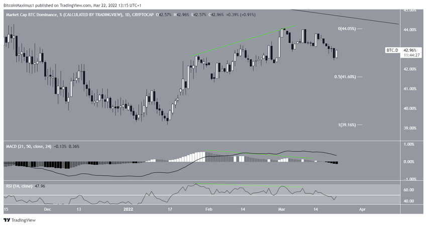 Jeśli ruch spadkowy będzie kontynuowany, można oczekiwać, że wskaźnik dominacji Bitcoina odnajdzie wsparcie na poziomie zniesienia 0,5 Fib przy 41,60%.