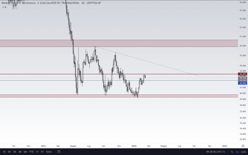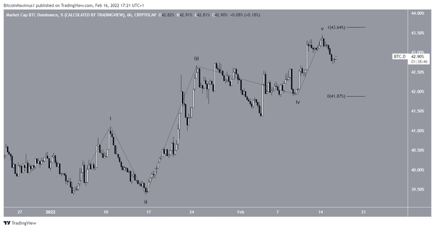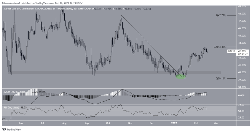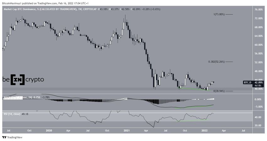 Wykres tygodniowy pokazuje, że BTCD wielokrotnie odbijał się od 40% horyzontalnego obszaru wsparcia, w maju i wrześniu 2021 r. oraz styczniu 2022 r. Wskaźnik dominacji Bitcoina nie osiągnął zamknięcia poniżej tego horyzontalnego obszaru od początku 2018 roku.