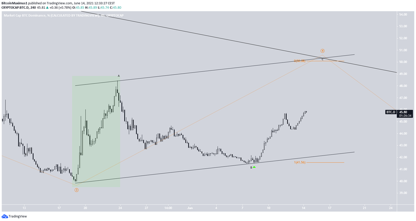 Trader kryptowalutowy @Pentosh1 nakreślił wykres BTCD, który pokazuje ruch w górę w kierunku 52%. Jak wskazano powyżej, jest to poziom oporu przy zniesieniu 0,382 Fib.