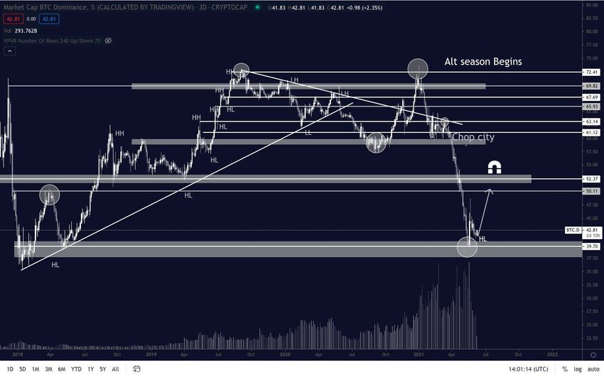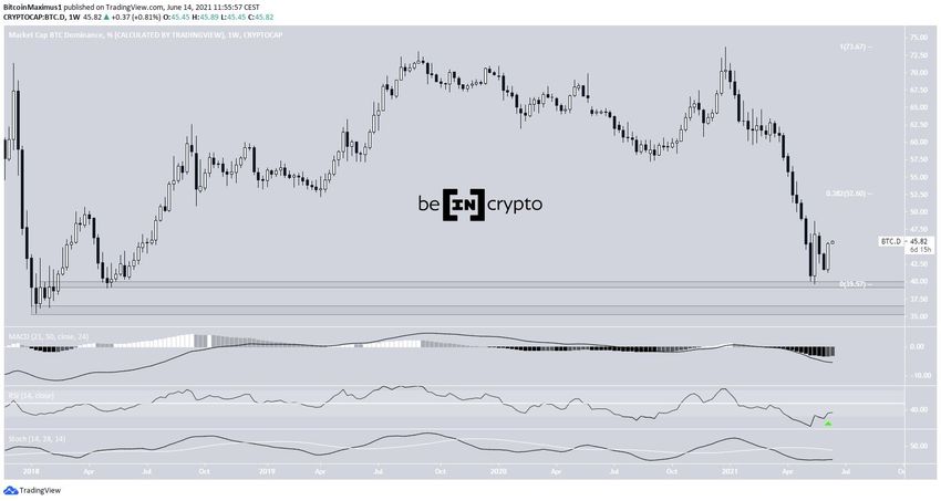 Wskaźnik dominacji Bitcoina spada od czasu osiągnięcia szczytu na 73,63% w grudniu 2020 roku. Do tej pory osiągnął dołek na poziomie 39,66% w dniu 19 maja 2021 roku.