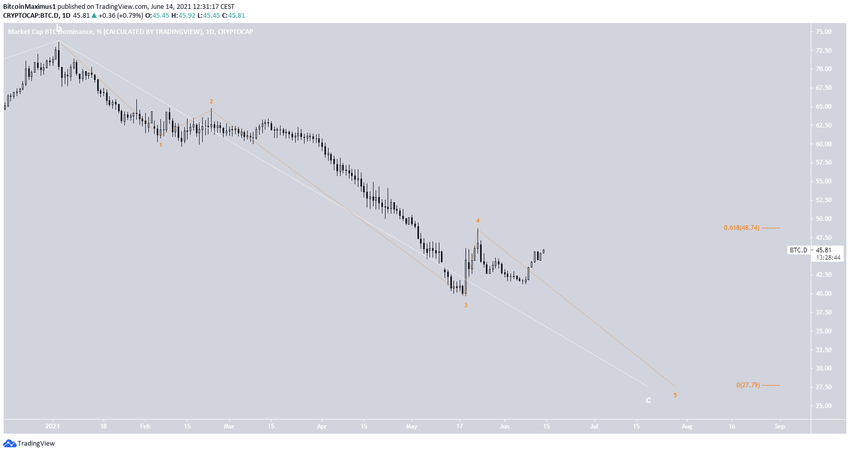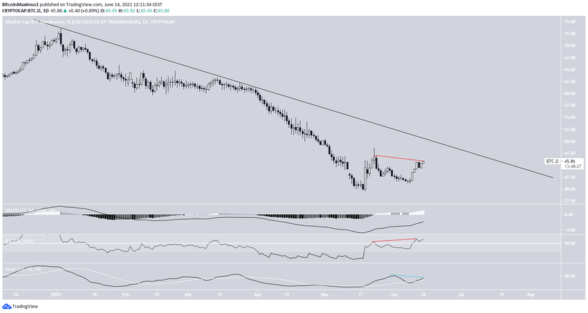 Spojrzenie na wykres dzienny pokazuje, że BTCD podąża za opadającą linią oporu od stycznia 2021 roku. Wskaźnik został przez nią odrzucony w dniu 24 marca, co doprowadziło do wspomnianego wcześniej dołka. Obecnie linia ta znajduje się w pobliżu 49%.