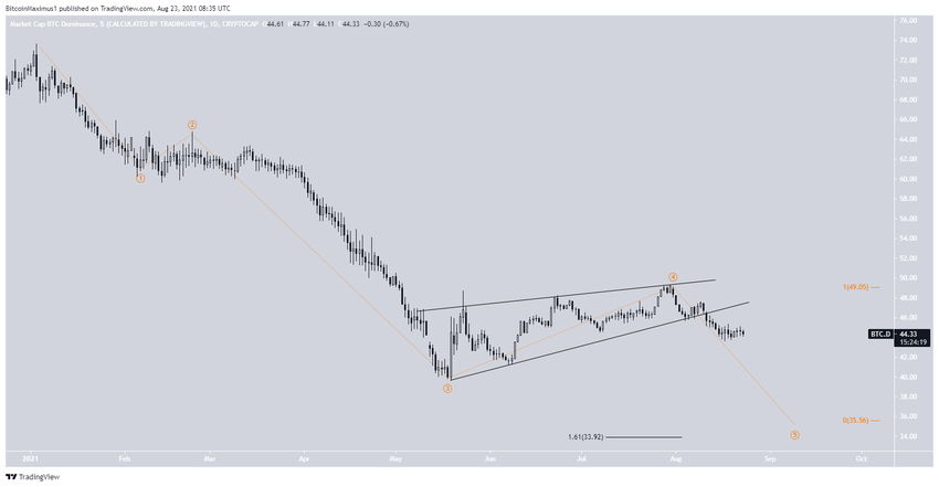 Wskaźnik dominacji Bitcoina wzrastał wewnątrz klina zwyżkującego od dnia 19 maja. Konsolidował się wewnątrz tej formacji aż do osiągnięcia szczytu na poziomie 49,24% w dniu 30 lipca. Od tego czasu porusza się w dół.