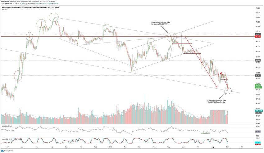 Kryptowalutowy trader @Anbessa100 przedstawił wykres dominacji Bitcoina, który pokazuje, że jego wartość osiągnie obszar 59%. Przewiduje on odbicie, które oznaczałoby spadek altcoinów. Od publikacji tweeta BTCD faktycznie odbił się od dna na 59% i osiągnął wartość 61%.