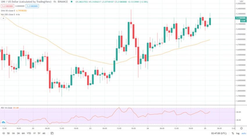 Cena UNI ponownie przekroczyła 5 USD, gdy rynki kryptowalut odbiły się po tygodniowych stratach. Token powoli wracał do siebie, od poziomu 3,70 USD, który był najniższy 22 września.