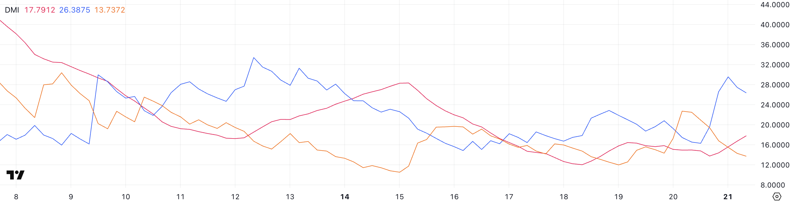 Wskaźnik kierunkowego ruchu (DMI) pokazuje znaczącą zmianę impetu, z jego średnim wskaźnikiem kierunkowym (ADX) rosnącym do 17,79, z 13,77 wczoraj.