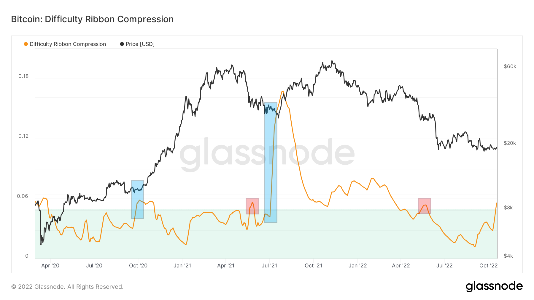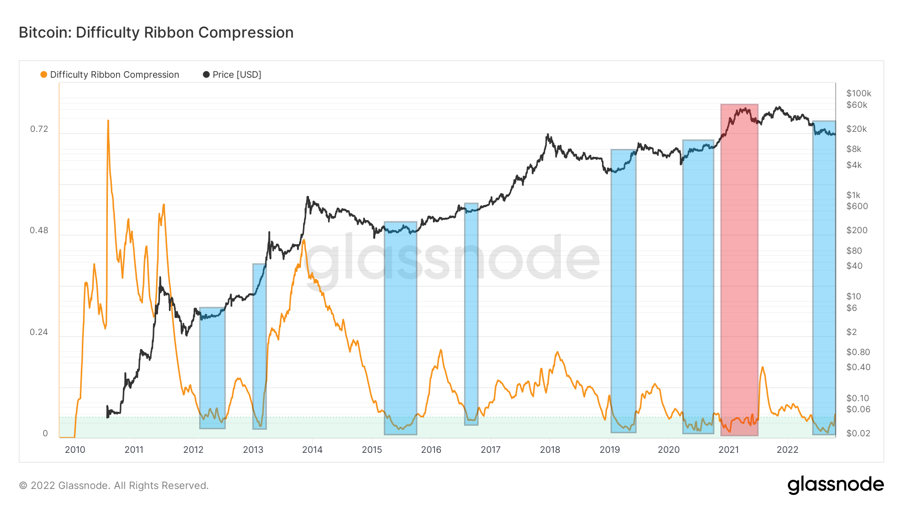 W dzisiejszej analizie BeInCrypto przygląda się historycznej skuteczności tego wskaźnika i podobieństwom z dołkiem poprzedniego rynku niedźwiedzia z lat 2018-2019. Ponadto zestawiamy go z innym wskaźnikiem aktywności górników on-chain o nazwie kompresja wstęgi trudności, który właśnie wyszedł z obszaru wykupienia. Zwykle, choć nie zawsze, to wydarzenie było sygnałem nadchodzącego odbicia ceny Bitcoina.