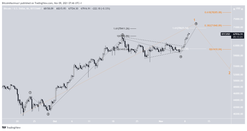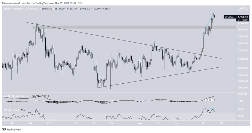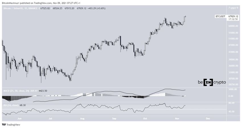 8 listopada wykres Bitcoina utworzył byczą świecę, która zaprowadziła BTC do nowego ATH. Wzrost był kontynuowany następnego dnia, a Bitcoin do tej pory osiągnął nowy ATH na poziomie 68 524 USD.