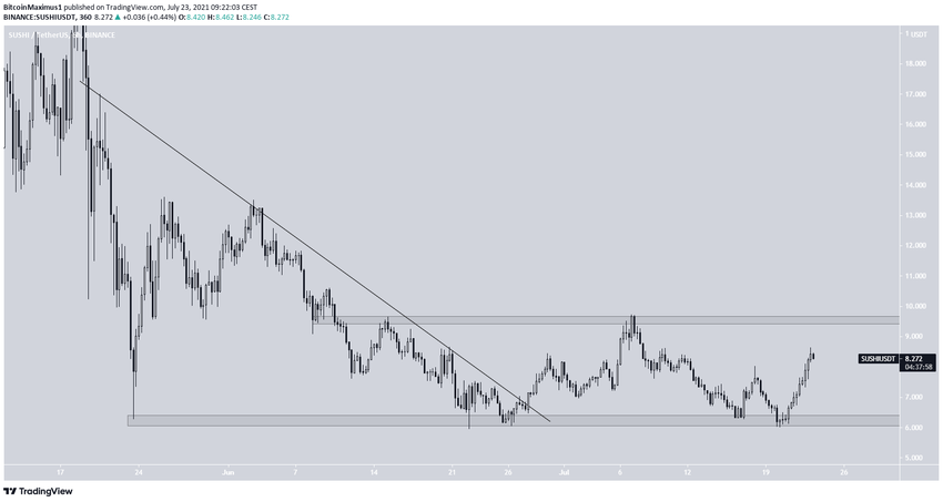 Obecnie SUSHI handluje w przedziale od 6,20 do 9,50 USD. Wybicie powyżej tego ostatniego może spowodować gwałtowny wzrost.