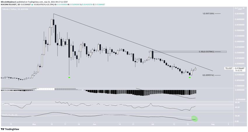 TEL również podąża za malejącą linią oporu. Jeśli nastąpi wybicie, najbliższy poziom oporu zostanie znaleziony na 0,03 USD.