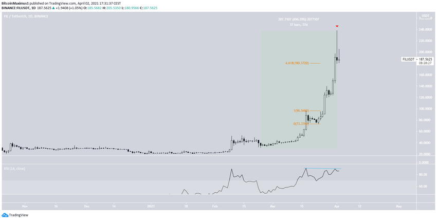FIL wzrastał parabolicznie od 23 lutego. W dniu 1 kwietnia osiągnął ATH na 238 USD. Jednak stworzył też świecę spadającej gwiazdy i od wczoraj ulega korekcie. Spadająca gwiazda jest często postrzegana jako niedźwiedzi znak odwrócenia.