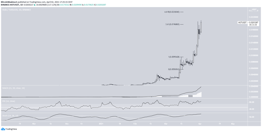 Jeśli nadal będzie rosnąć, to HOT może spodziewać się następnego oporu na 0,023 USD. Jest to zewnętrzne zniesienie 4,61 Fib w stosunku do poprzedniego ruchu w dół i może potencjalnie działać jako szczyt.