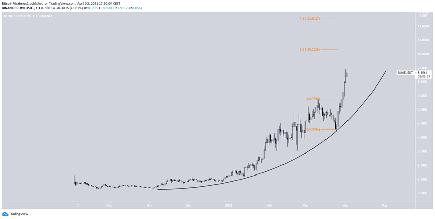 RUNE rośnie od czasu odbicia się z parabolicznej, wznoszącej linii wsparcia w dniu 25 marca.