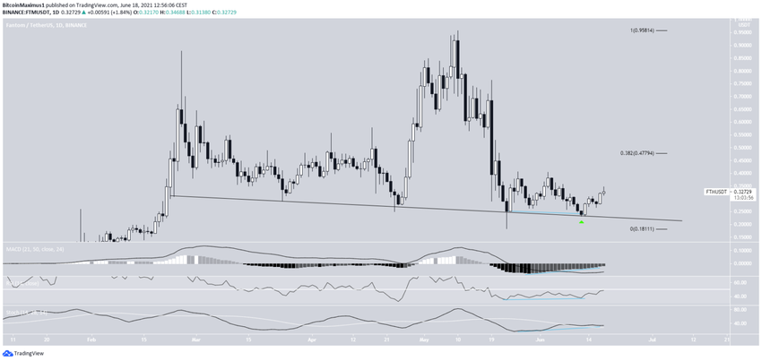 TFUEL wyszedł z malejącego kanału równoległego 1 czerwca (zielona ikona). Udało mu się osiągnąć nowe ATH 9 czerwca. Jednak wkrótce potem spadł. Szczyt osiągnięto na potencjalnym poziomie oporu na rozciąganie Fib na poziomie 0,69 USD (biały).
