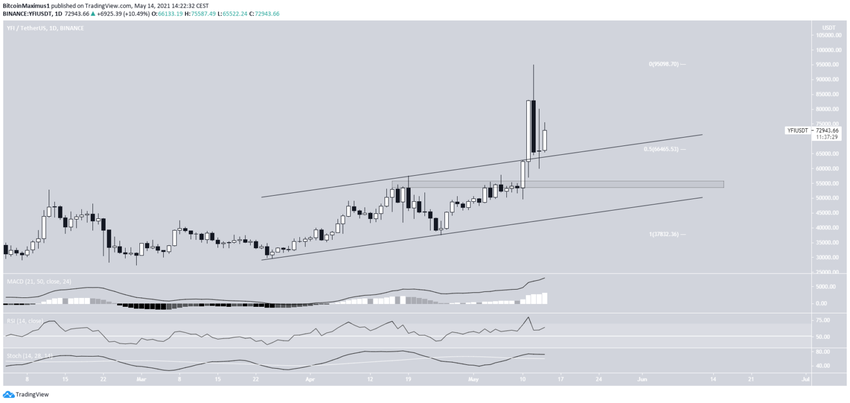 YFI rusza w górę od czasu wyrwania się z rosnącego kanału równoległego 10 maja. Dwa dni później udało mu się osiągnąć nowe ATH, wynoszące 95 000 USD.