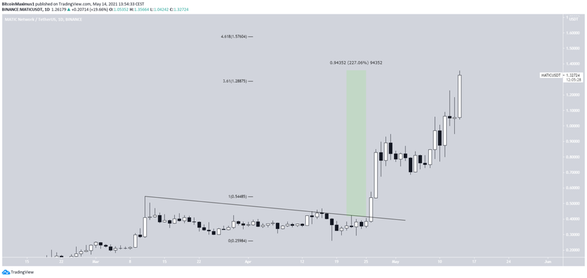 MATIC rośnie od czasu wyjścia z opadającej linii oporu 26 kwietnia. Od tego czasu wzrósł o 227%, co doprowadziło do nowego rekordowego poziomu 1,356 USD, który został osiągnięty 14 maja.