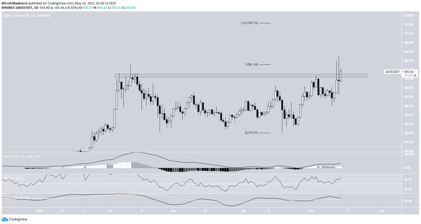 AAVE poruszał się w górę od 18 kwietnia. 13 maja osiągnął nowy rekordowy poziom 621 USD, po czym nieznacznie spadł.