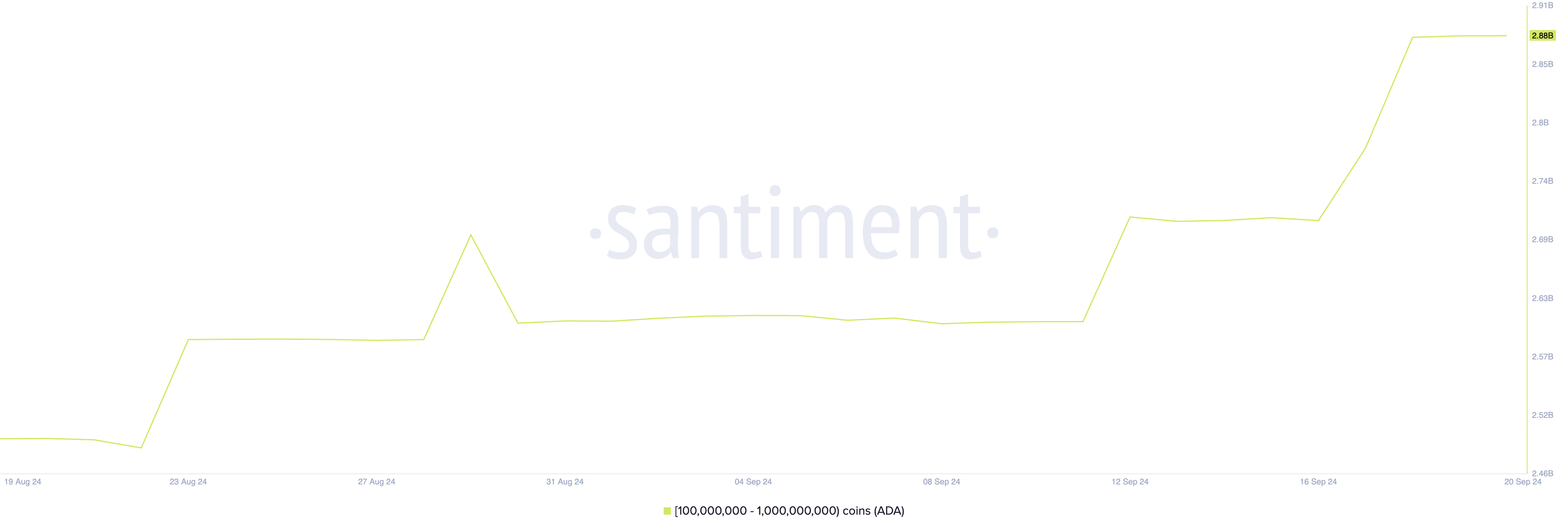 Oprócz poprawy ogólnego nastroju na rynku, wybicie Cardano było częściowo napędzane przez wzrost aktywności wielorybów. Dane on-chain pokazują, że adresy posiadające między 100 mln a 1 mld ADA stopniowo pogłębiały swoją akumulację od początku września.