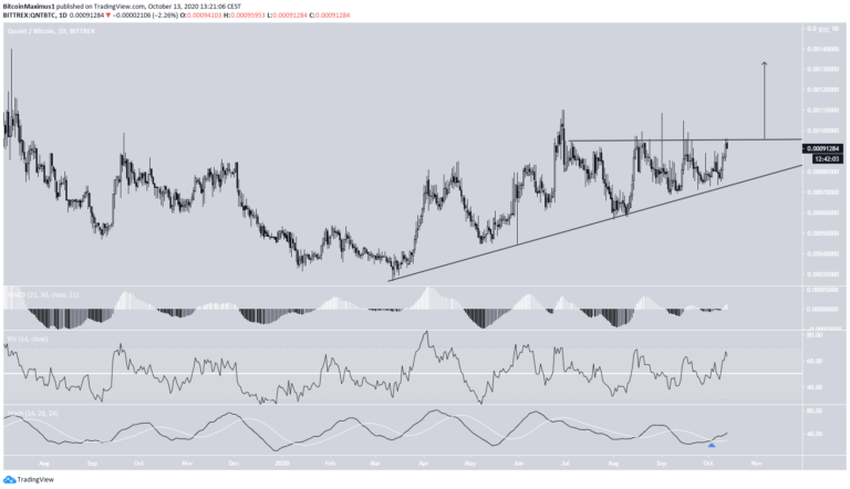 Cena QNT/BTC wykazuje podobny ruch jak QNT/USD. Jednak zamiast wybić się z symetrycznego trójkąta, wydaje się, że nadal znajduje się ona wewnątrz trójkąta wstępującego.