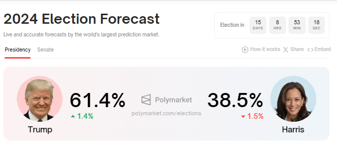 Według badaczy z CoinShares, podkreśla to rosnące zainteresowanie inwestycjami w krypto w kraju. Odliczanie do wyborów w USA trwa i pozostało tylko 15 dni. Według Polymarket, kandydat przychylny kryptowalutom, Donald Trump, prowadzi z przewagą 22,9 punktu procentowego nad Kamalą Harris.
