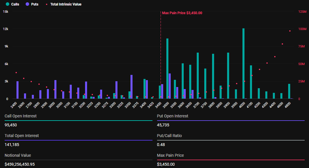 141 185 opcji na Ethereum również wygaśnie dziś, w porównaniu do 205 724 w pierwszym tygodniu 2025 roku. Wskaźnik put-to-call jest na poziomie 0,48, a maksymalny punkt bólu wynosi 3450 USD. Dlatego wygaśnięcia mogą wpłynąć na krótkoterminowy ruch cen ETH.