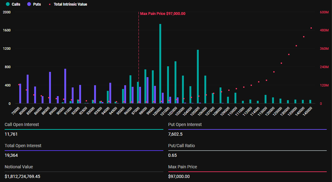Zgodnie z danymi od Deribit dziś wygaśnie 19 364 opcji na Bitcoin, nieco mniej niż na początku roku, gdy 19 885 kontraktów BTC wygasło w zeszłym tygodniu. Kontrakty opcyjne, które wygasają dziś, mają wskaźnik put-to-call na poziomie 0,65 i maksymalny punkt bólu wynoszący 97 000 USD.