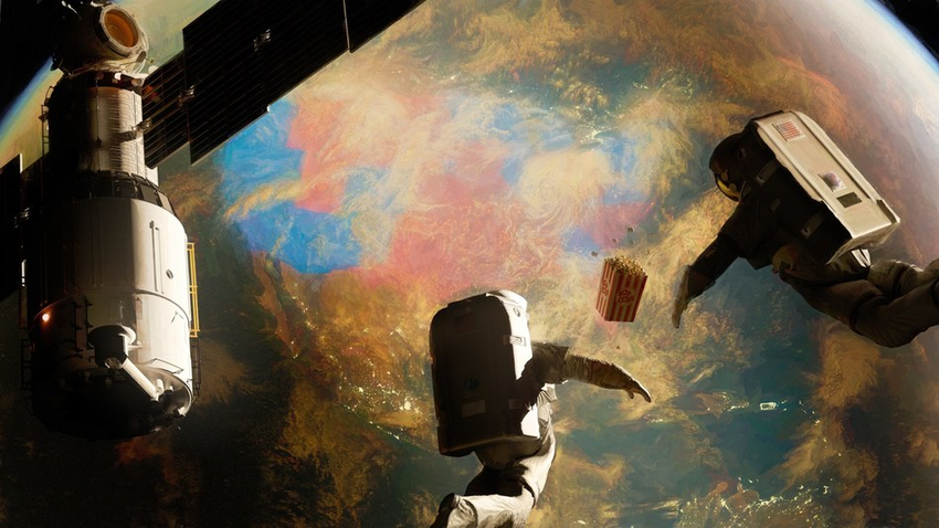 Grafika przedstawia astronautów na orbicie spoglądających w dół na Stany Zjednoczone. Każdy stan jest wyróżniony zgodnie z wynikami jego Kolegium Elektorów w wyborach prezydenckich w USA w 2020r.