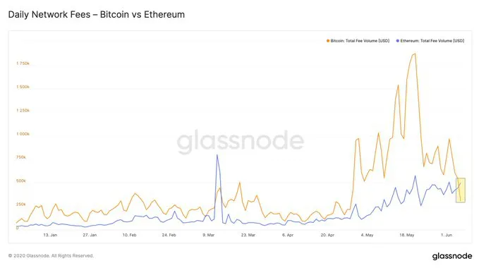 6 czerwca, dzienne całkowite opłaty sieciowe Ethereum przewyższyły opłaty Bitcoinowe. Opłaty Ethereum za średnią dzienną transakcję sieciową w sumie wyniosły około $ 502,000 i $ 546,000 na 6 i 7 czerwca, podczas gdy Bitcoin doświadczył opłat w wysokości $ 310,000 i $ 252,000.