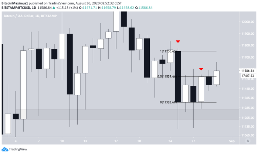Dnia 25 sierpnia cena Bitcoina utworzyła niedźwiedzią świecę pochłaniającą, która obniżyła cenę do poziomu 11 112 USD. Jednak BTC stworzył długi dolny knot i odbił się od obszaru wsparcia na 11 200 $. Cena od tego czasu koryguje się w górę.