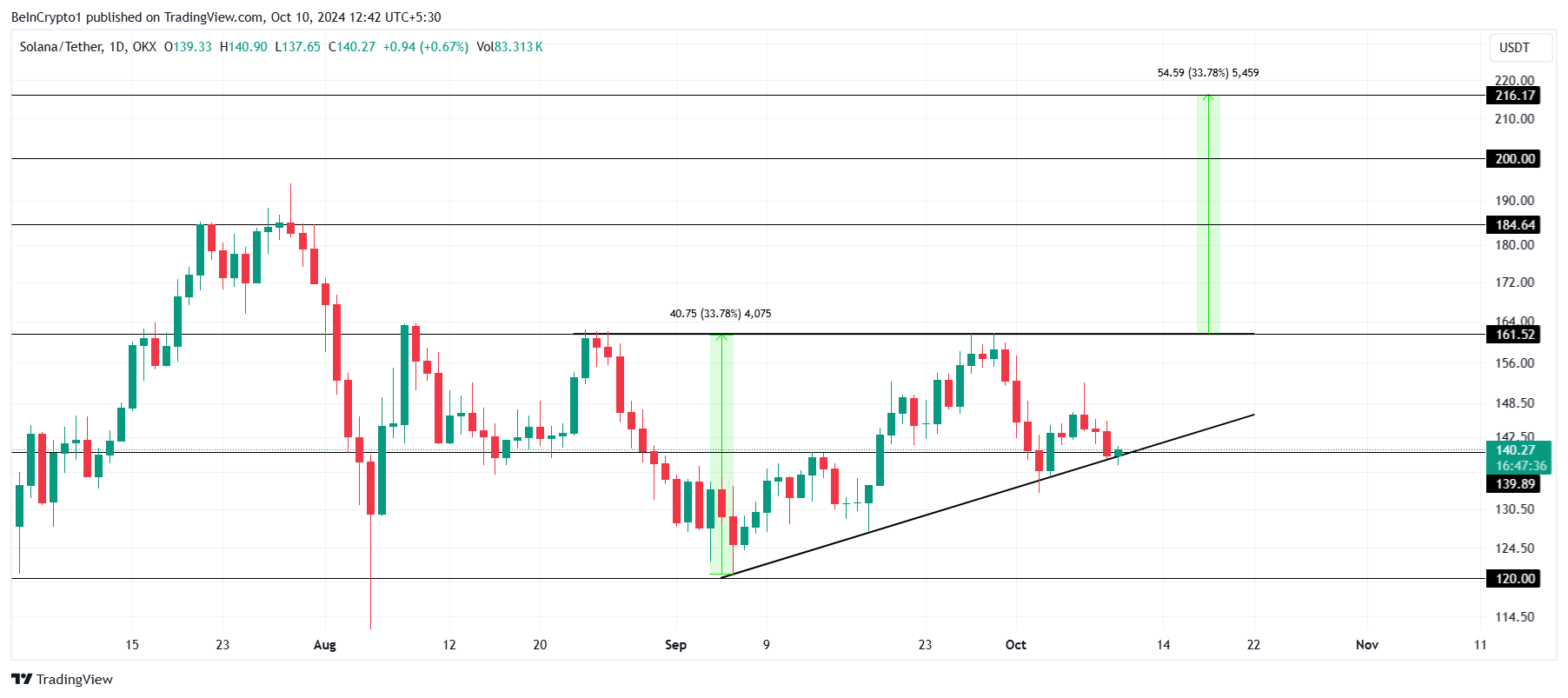 W chwili pisania tego tekstu, Solana jest notowana po 140 USD, utrzymując się powyżej kluczowego poziomu wsparcia 139 USD. Kryptowaluta obecnie porusza się w ramach wzoru trójkąta rosnącego, który zwykle poprzedza wybicie. Jeśli SOL zdoła wybić się z tej formacji, jej cena może wzrosnąć o 33%, osiągając 216 USD.