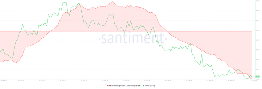 Wskaźnik MVRV (Market Value to Realized Value) Long/Short Difference wynosi obecnie -18%, co wskazuje, że krótkoterminowi posiadacze są na zysku. Choć to wydaje się pozytywne dla STH, jest to sygnał niedźwiedzi dla szerszego rynku. Krótkoterminowi posiadacze mają tendencję do sprzedaży swoich aktywów, gdy tylko zobaczą zyski, co może utrzymywać cenę Ethereum na niskim poziomie, zwłaszcza jeśli Ethereum zbliży się do 2000 USD.