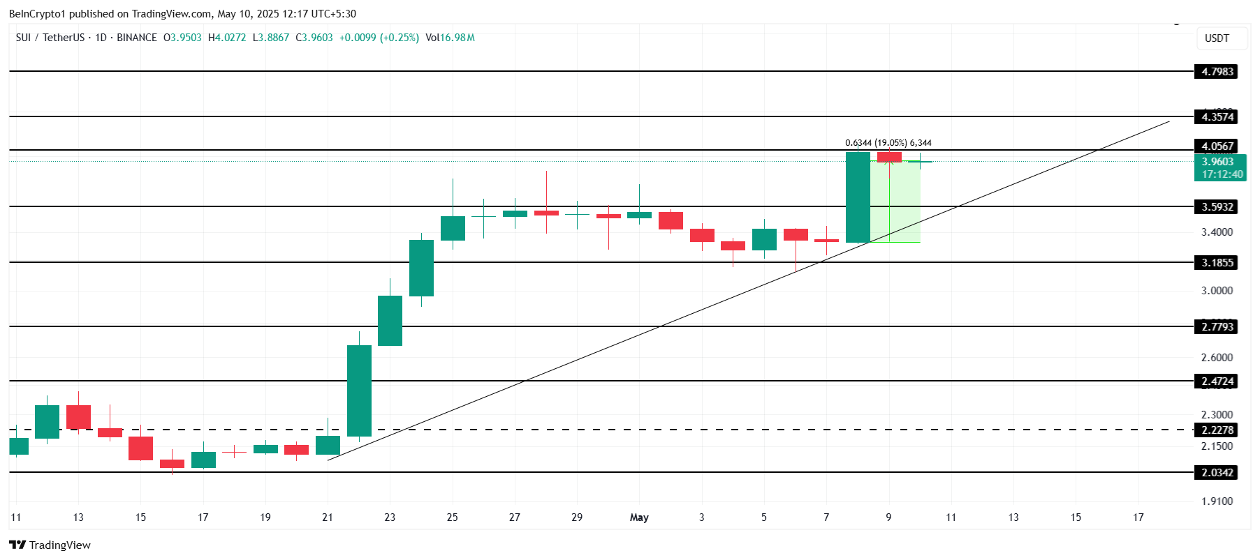 Cena SUI wzrosła o prawie 20% w ciągu ostatnich 48 godzin, handlując na poziomie 3,96 USD w momencie pisania. Altcoin przyciągając kapitał, zbliża się teraz do kluczowego poziomu oporu na 4,05 USD.