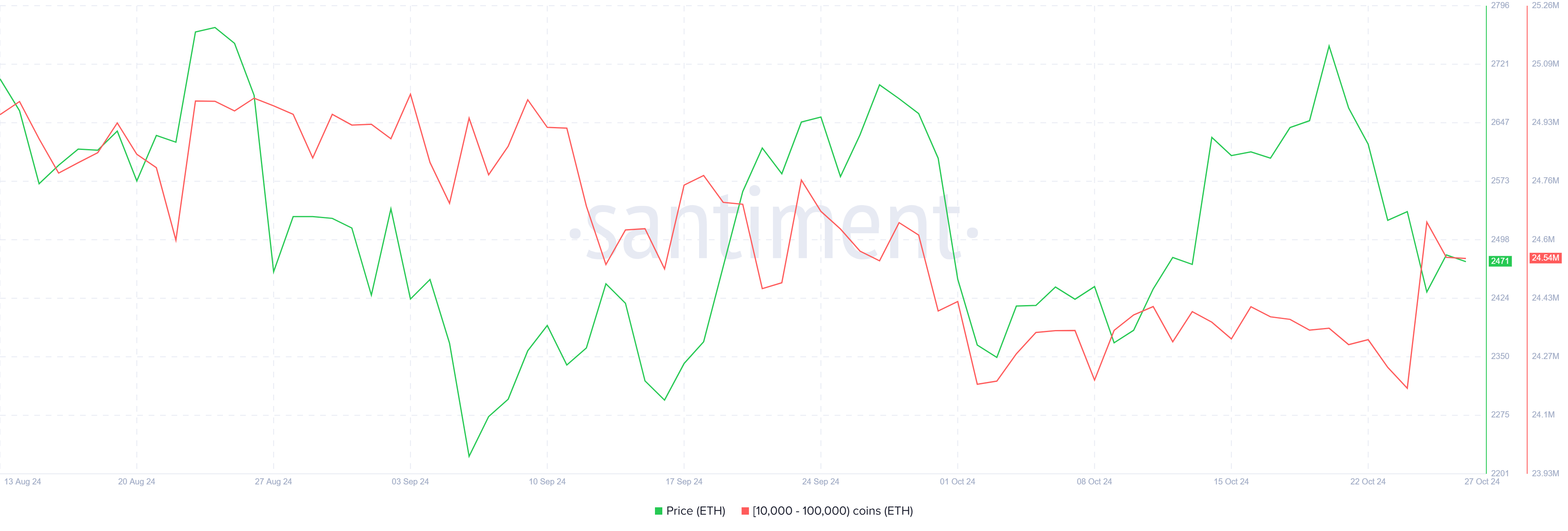 W trakcie sprzedaży wieloryby podejmują działania, aby przeciwdziałać spadkom. Ta grupa inwestorów posiadających wysokie zasoby aktywa – między 10 000 a 100 000 ETH – niedawno zgromadziła ponad 360 000 ETH, warte około 880 mln USD.