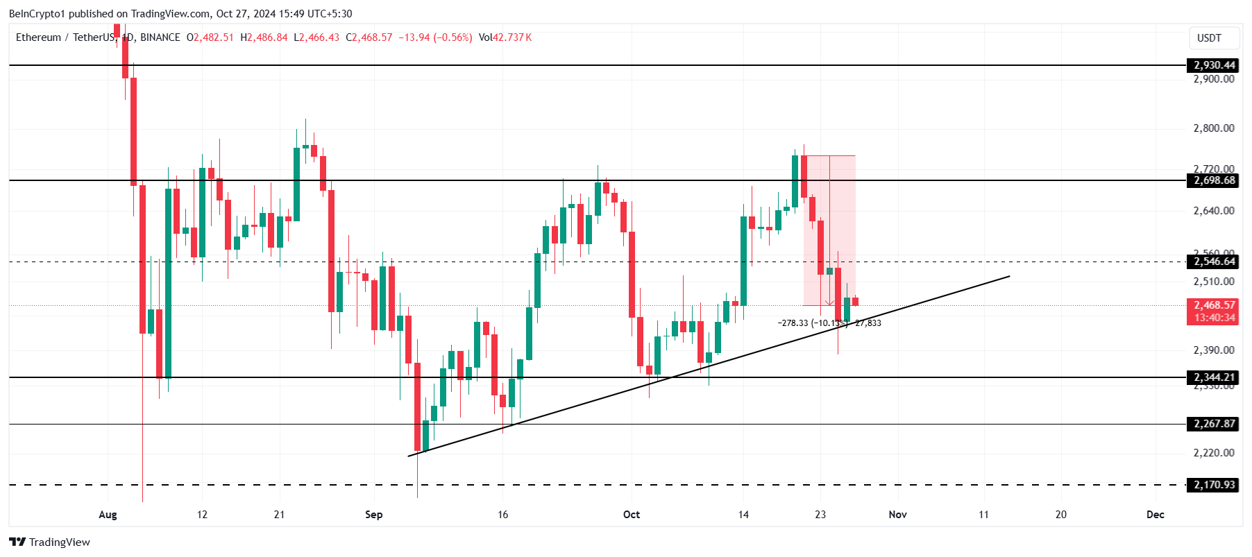 Ostatni 10% spadek Ethereum zbliżył go niebezpiecznie do linii wzrostowej, testując ten poziom jako wsparcie. Spadek nastąpił po serii nieudanych prób przebicia powyżej 2700 USD, co stawia obecną cenę altcoina pod znaczną presją. Ta czwarta nieudana próba zwiększyła podatność ETH, chociaż linia wzrostowa nadal zapewnia pewną stabilność.