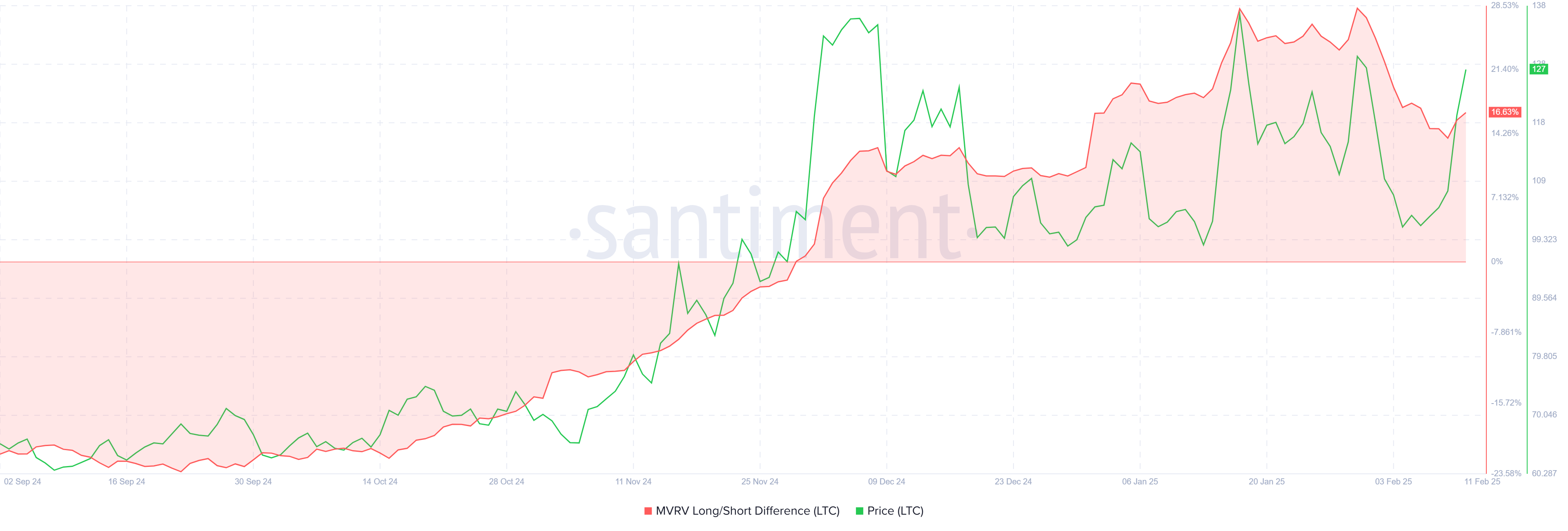 Wskaźnik wartości rynkowej do zrealizowanej wartości (MVRV) różnica długoterminowa/krótkoterminowa pokazuje, że mimo niedawnego spadku ceny, długoterminowi posiadacze (LTH) nadal są na plusie. To pozytywny sygnał, ponieważ LTH zazwyczaj stanowią fundament każdej kryptowaluty. Ich gotowość do trzymania w czasie spadków wspiera ideę dalszego ożywienia Litecoina.