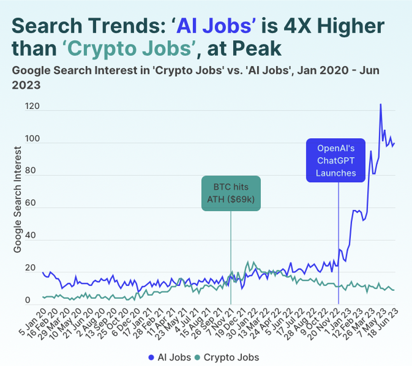 Dane Google Trends wskazują, że zainteresowanie ofertami pracy związanymi ze sztuczną inteligencją osiągnęło szczyt czterokrotnie wyższy niż w przypadku ofert pracy związanych z kryptowalutami. Uruchomienie ChatGPT OpenAI i inwestycje w sztuczną inteligencję przez Google i Microsoft pobudziły ten trend wzrostowy.