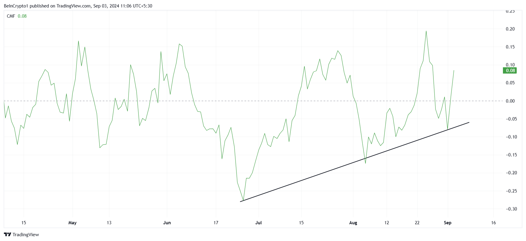 Ostatni wzrost ceny ORDI można przypisać kilku czynnikom. Jednak niewątpliwie kluczowym czynnikiem jest wytrwałość jego inwestorów. Wskaźnik przepływu pieniędzy Chaikin (CMF) pokazuje, że altcoin odnotował stałe przepływy od końca czerwca. Te przepływy były kluczowe w utrzymaniu odporności monety na niedawne niedźwiedzie trendy na szerszym rynku.