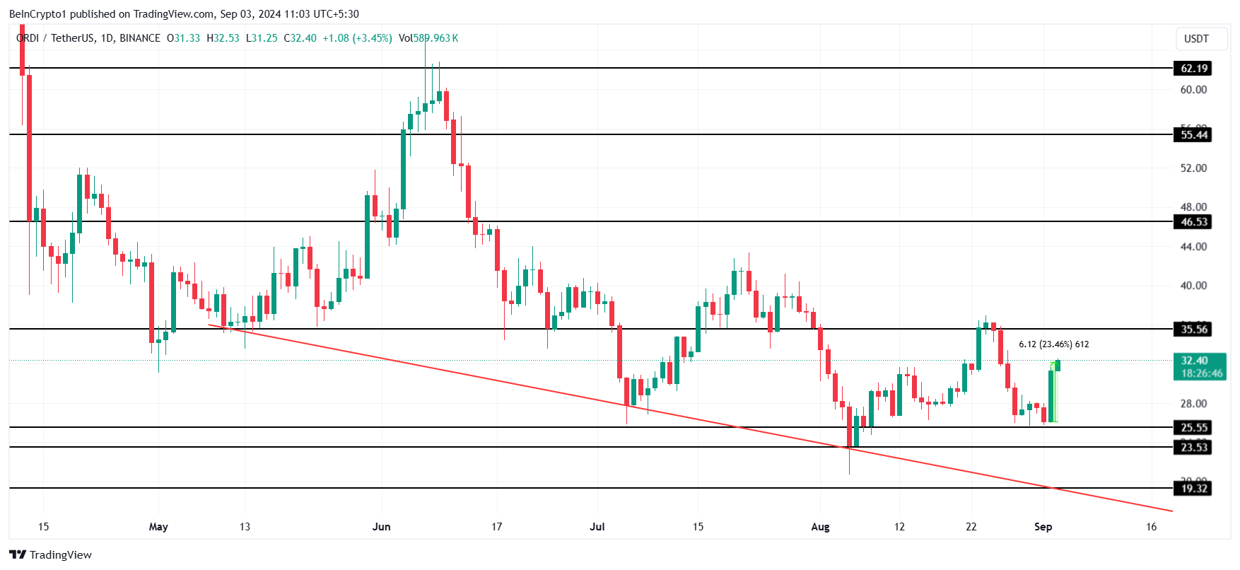 Cena ORDI, obecnie na poziomie 32,40 USD, wzrosła o 23% w ciągu ostatnich 24 godzin po spadku prawie do poziomu wsparcia na 25,55 USD. Jeśli pozytywne czynniki będą się utrzymywać, altcoin może przełamać poziom oporu na 35,56 USD. Gdy ten poziom zostanie ustanowiony jako wsparcie, altcoin może zacząć gwałtownie rosnąć.