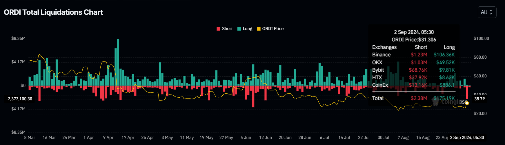 Historycznie wzrosty w likwidacjach krótkich często były następnie okresem odbudowy dla ORDI. Ten wzorzec sugeruje, że altcoin może być na progu trendu wzrostowego, gdyż krótki pozycje są zamykane. Dalej to zmniejsza presję spadkową na cenę i toruje drogę do potencjalnych zysków.