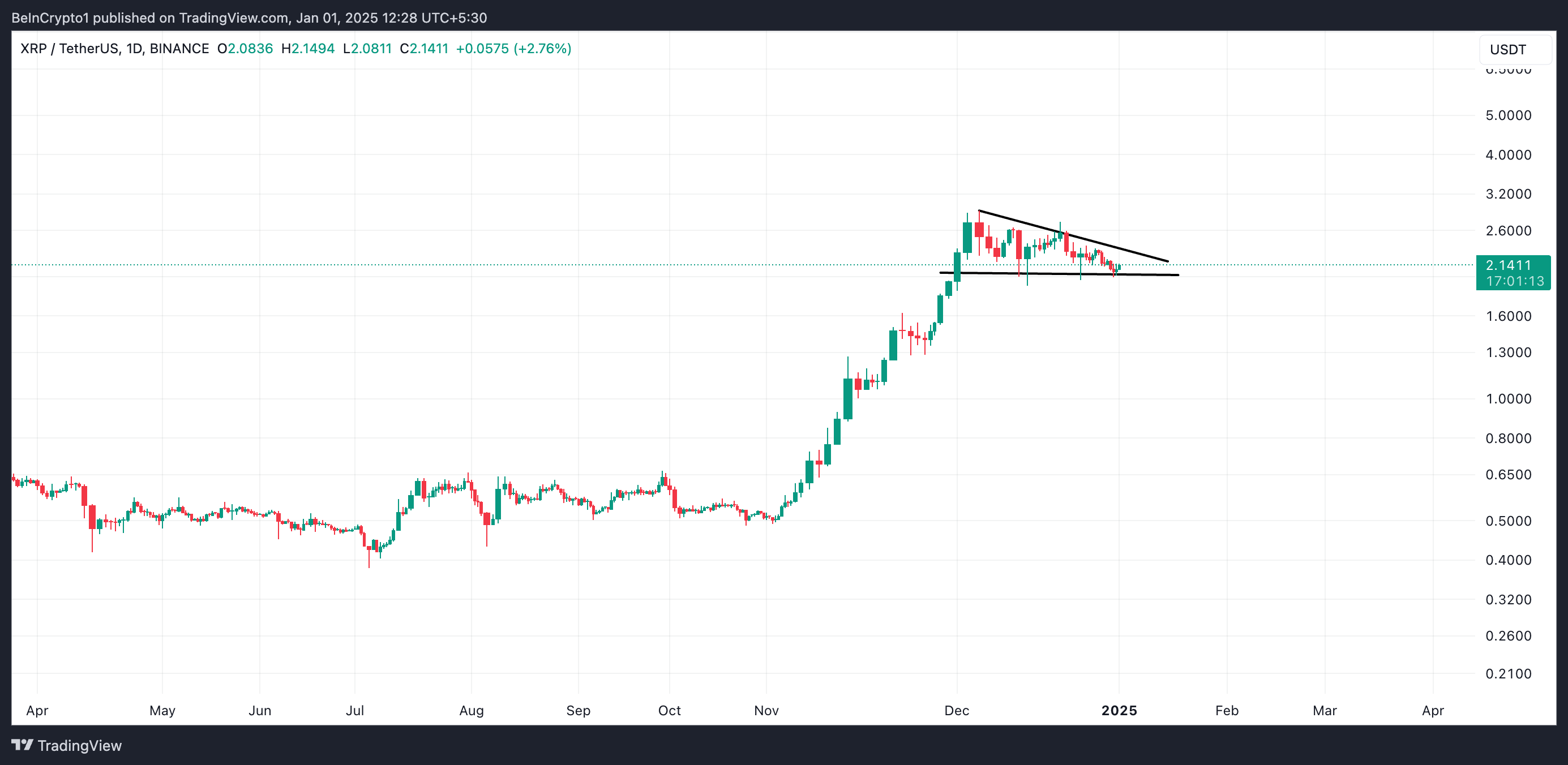 Ocena wykresu XRP/USD wykazała, że od momentu osiągnięcia szczytu na poziomie 2,90 USD 3 grudnia, kryptowaluta utknęła w opadającym trójkącie. Jest to z punktu widzenia technicznego niedźwiedzim wzorcem.