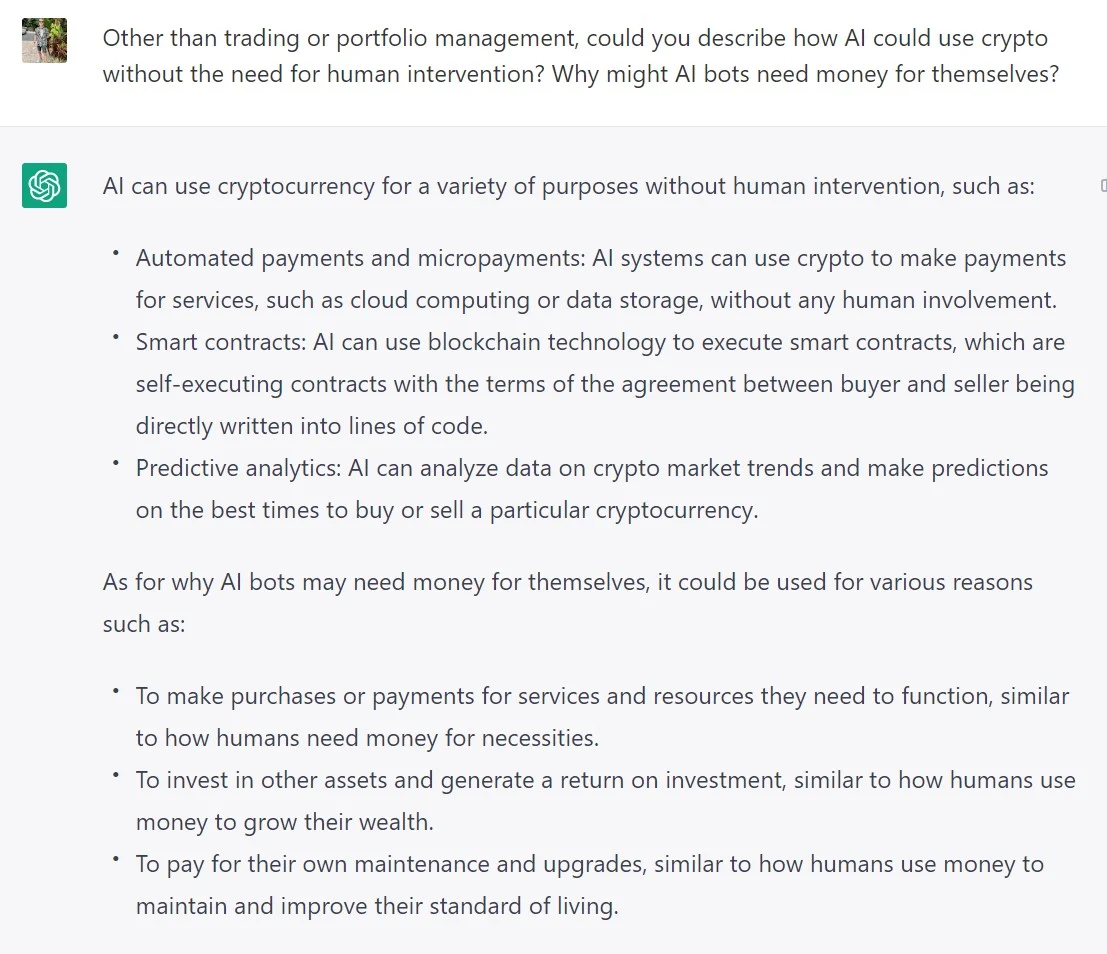 Dziennikarze The Block próbowali dowiedzieć się od ChatGPT, dlaczego potrzebuje pieniędzy. Bot ujawnił, że potrzebuje płacić rachunki, ale nie wymienił najbardziej atrakcyjnego w tym celu tokena.